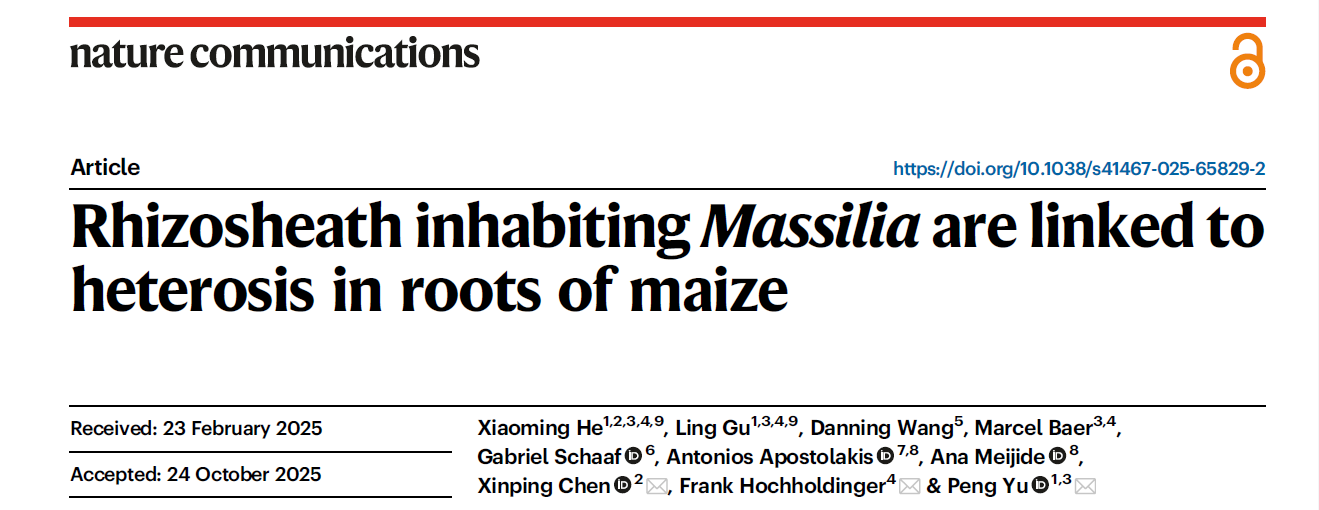 杂种优势通常指F1代杂交种在综合农艺性状上优于其亲本自交系的现象。长期以来,传统杂交育种理论与实践多聚焦于高产、抗逆等地上部性状的改良,而地下根系性状则常被忽视,往往只能作为地上部选择的间接结果被被动接受,这导致兼具高产潜力和养分高效利用能力的玉米品种较为缺乏。2025年11月28日,陈新平教授团队联合慕尼黑工业大学在Nature Communications 在线发表了题为“Rhizosheath inhabiting Massilia are linked to heterosis in roots of maize”的论文。系统解析玉米杂种优势形成并促进氮素高效吸收与利用的微生物学机制,将有助于进一步利用杂种优势改良玉米的养分利用效率,并为未来作物育种及有益微生物合成群落的应用提供理论依据。