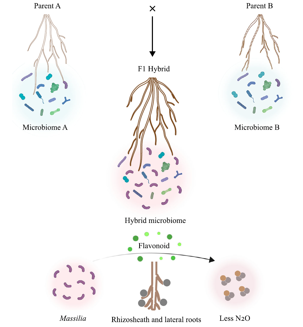 团队利用多个玉米杂交群体,系统研究土壤微生物在杂种优势形成中的关键作用,并结合微生物组学、代谢组学及根系表型学等多组学方法,解析了Massilia 通过调控玉米根系侧根发育与黄酮代谢途径,在低氮胁迫增强玉米杂种优势的生物学机制,为揭示植物-微生物互作如何影响杂种优势的形成提供了新的生物学机制。同时,创新性地引入了整合根系发育、分泌物和微生物互作的可遗传性状“根鞘”,发现较大的根鞘能够招募在养分循环和胁迫适应方面功能富集的有益微生物,尤其是Massilia。同时,可以有效减少土壤氮素的气态损失。为理解杂种优势形成机制提供了新的思路,也为作物育种提供了新的靶点。该性状可通过优化根系-微生物互作,提高氮利用效率、降低化肥投入并增强作物产量稳定性,为绿色农业提供理论依据。