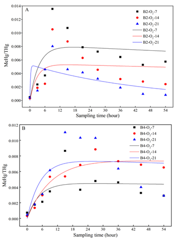 不同氧浓度下P.fluorescensTGRB2和P.putidaTGRB4的iHg甲基化动力学特征。(A)B2-O2-7、B2-O2-14和B2-O2-21;(B)B4-O2-7、B4-O2-14和B4-O2-21。
