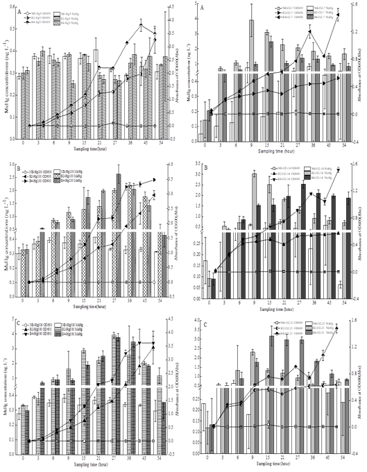 左图 不同iHg水平下P.fluorescensTGRB2和P.putidaTGRB4的甲基汞含量和生长曲线的变化。(A)B2-Hg0、B4-Hg0和对照NB-Hg0;(B)B2-Hg100、B4-Hg100和对照NB-Hg100;(C)B2-Hg500、B4-Hg500和对照NB-Hg500;